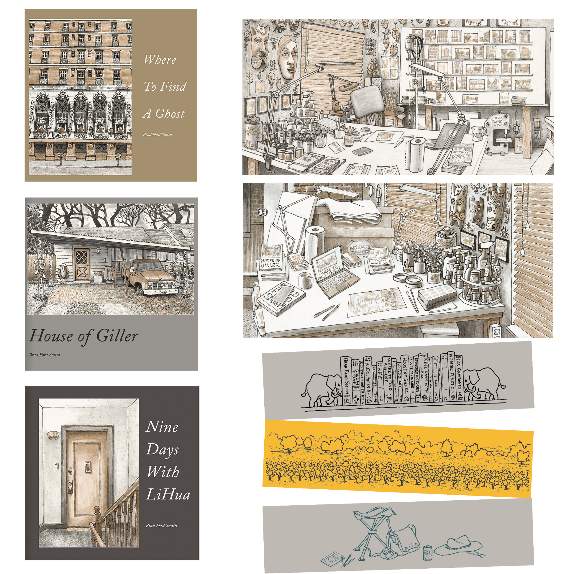 Materials: Softcover books. House Of Giller, Nine Days With LiHua are staple bound. Where To Find A Ghost is bound with a spine. Each title features matte lamination on the cover, with walnut and India ink drawings, research notes and photographs throughout.