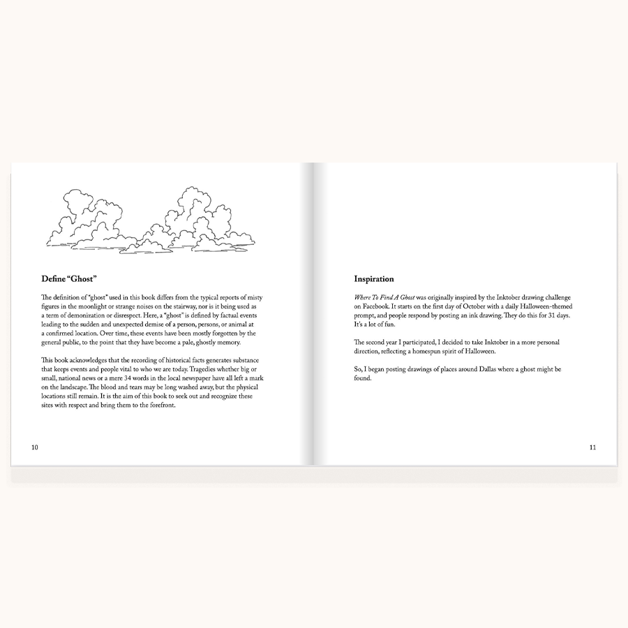 “Where To Find A Ghost” is a new chapbook collection and exhibition guide of drawings and stories depicting locations in and around Dallas where “historic events of calamity and tragedy” have occurred.